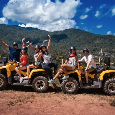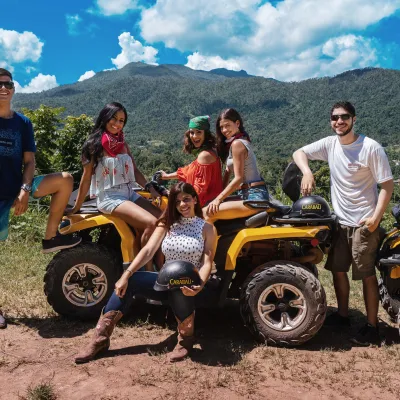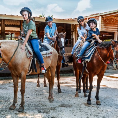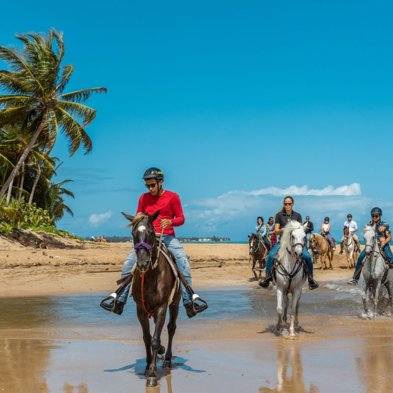 a group of people riding a horse on a beach
